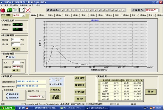 可进行试验参数设定,设置自动采集/停止/记录/分析/计算,实时显示每通道放热曲线,进行1~7天水合热计算并生成测试报告。界面简洁友好,16个通道独立运行,用颜色指示每通道的实时采集状态,并设有数据追加/回放等功能,数据库文件可导入EXECL文件做进一步分析。