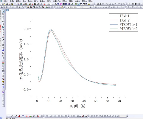 上图为与进口TAM热量仪进行同一标准水泥样品的对比试验,图示与TAM等温热量仪的放热量曲线和放热速率曲线吻合度很高,与TAM等温热量仪的放热速率峰值一致均为1.97mw/g